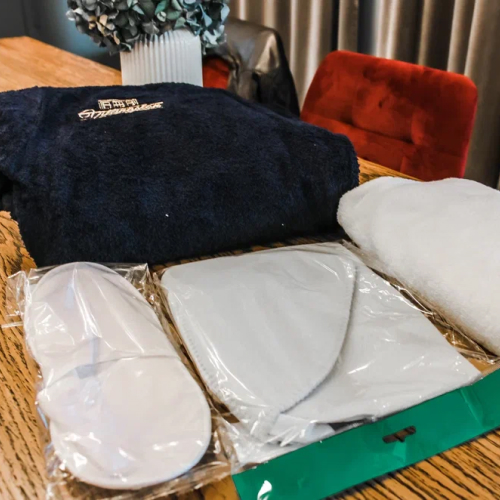 Включает в себя Тапочки Мужской махровый халат / Женская махровая накидка с чалмой Банная шапка Банный коврик Банное махровое полотенце Стоимость 800 рублей на человека