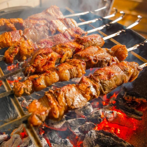 В набор для гриля входит: пакет угля 3 кг, жидкость для розжига, решетка, спички, шампуры предоставляются в аренду.
